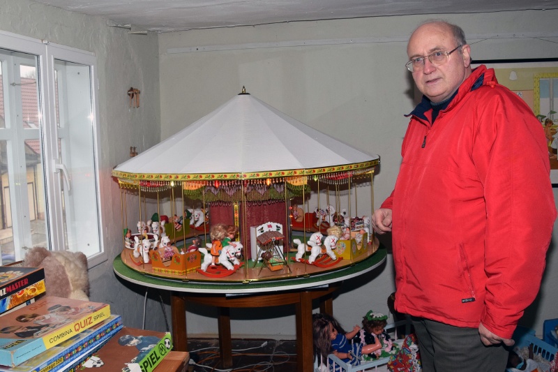 Henning Ihlenfeldt an einem Spielzeugkarussell der Heimatstube Fürstenwerder